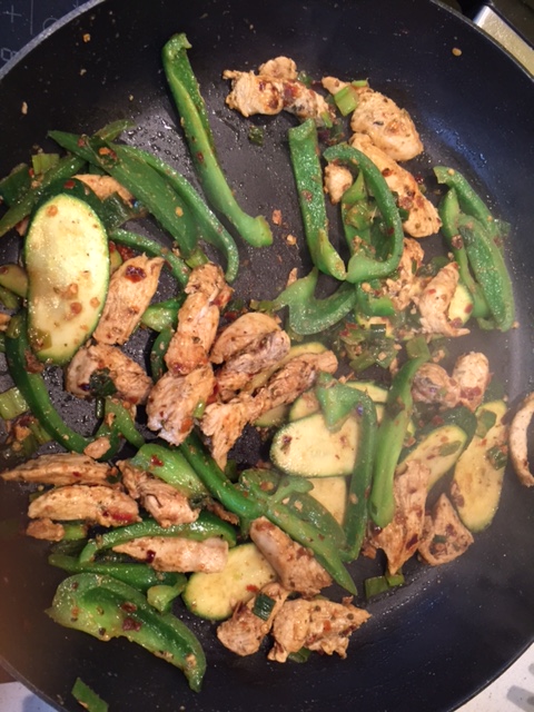 Heat frying pan with a little olive oil, fry the chicken for a couple of minutes, add veg and cook until done.