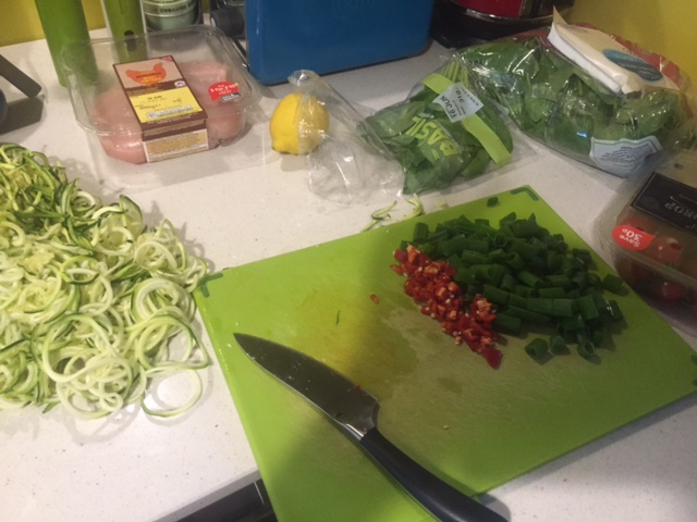 Begin by spiralizing your courgette into noodles, set aside. Chop the chilli, greens of spring onions, half your cherry tomatoes and get your chicken sliced/chopped.