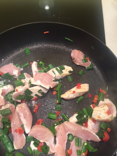In a large non-stick frying pan heat 1 tablespoon of olive oil and then add chilli, lemon zest and spring onion greens and stir fry for a few minutes. Add your sliced chicken and cook until almost done.