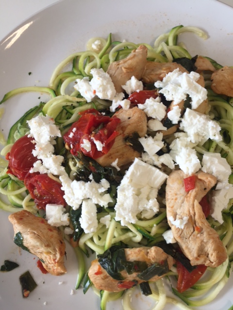 So here’s another fake pasta recipe, using really simple ingredients and best enjoyed al fresco with a glass of cold, white wine or two! This makes enough for 3 portions (two for dinner, one for lunch) to take a portion for lunch the next day – put aside 1 portion of the courgette spiralized without cooking in a airtight box and when you’re ready the next day microwave for 2 minutes, squeeze some lemon, olive oil, salt and pepper over and add the chicken mix and you’re good to go! You could scale up or down this recipe depending on the mouths your feeding!