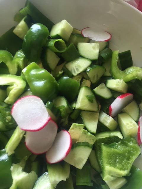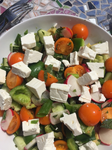 Start by de-seeding and chopping your green pepper and add to the serving bowl, slice your cucumber in similar size pieces and half your tomatoes and add to the pepper – stir to combine. Top and tail your radishes and slice thinly, finely slice the greens of the sprint onions and add to the salad. Skin and slice your avocado in similar sized chunks to the pepper an cucumber and add to the dish. Take the mint leaves off the tough stalks and finely chop and add to the salad. Finally chop your feta into largish chunks and sprinkle over the top of the salad.