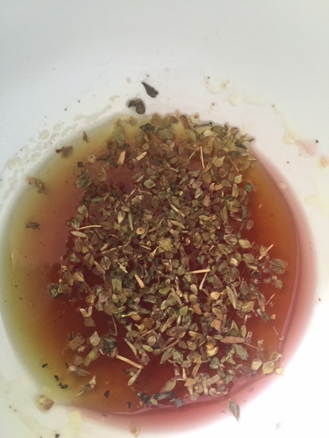 To make the dressing add the juice of half a lemon and around a tablespoon of red wine vinegar to a small bowl. Add dried oregano and salt and pepper, and add enough olive oil to make a thick dressing (1 part vinegar/lemon juice to 3 parts oil) whisk and pour over salad when ready to serve.