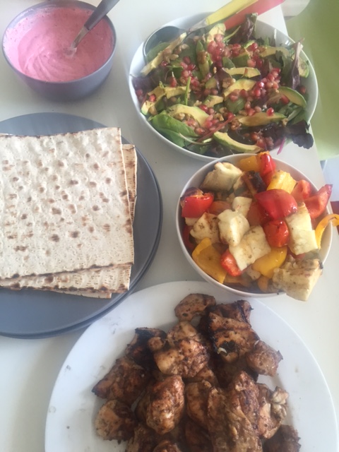 Lovely and fresh, zingy accompaniment to barbecued meat – I served this with Diana Henry’s recipe for chicken with pomegranate and honey glazed chicken skewers (substituted chicken breast for thigh meat) from her Bird in the Hand book http://amzn.to/1w5wky3, halloumi and vegetable skewers (just chop halloumi and the vegetables you wish to use, lightly coat in olive oil and season and add to metal skewers and bbq!) and from Ottolenghi’s Jerusalem book http://amzn.to/1MDeqNl yoghurt and sumac sauce (omitting garlic clove and instead substituting one tablespoon of plain olive oil for garlic infused oil).