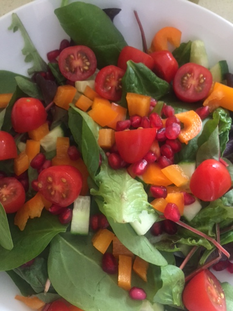 Begin by preparing the salad, put your salad leaves in a bowl, halve your cherry tomatoes and slice your pepper and cucumber to similar size chunks – add to the bowl. Pour in the pomegranate seeds and stir to combine. Put on your plates.