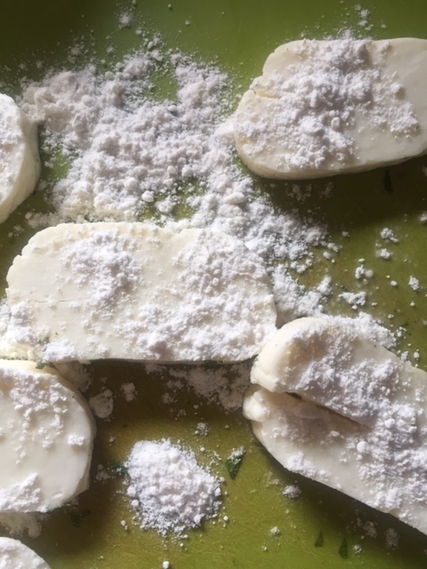 Slice your halloumi into 8 slices and on a plate or board mix your flour with salt and pepper and coat your halloumi in the flour.